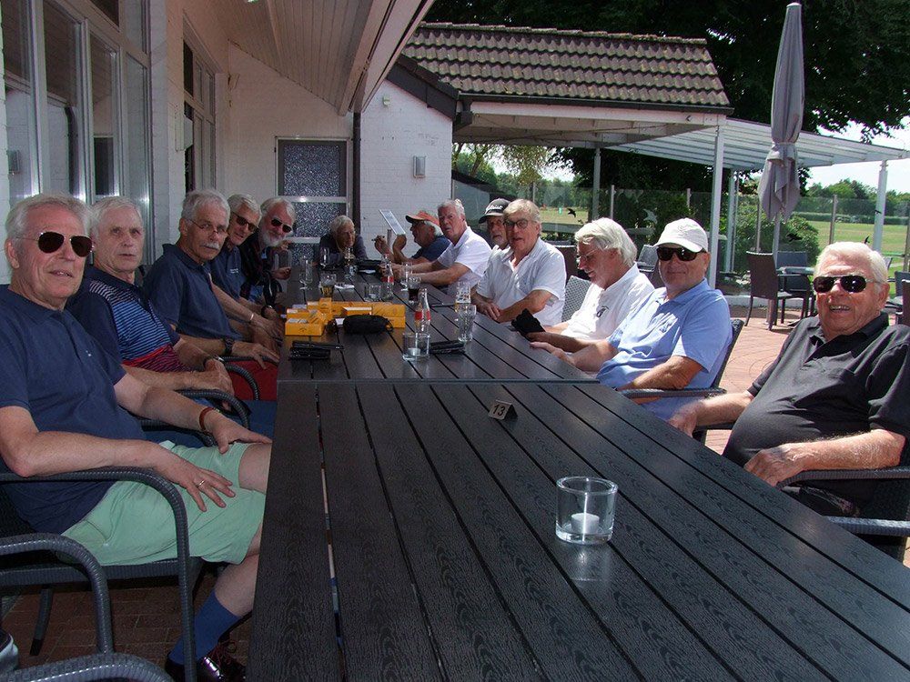 Nach dem Spiel suchten die Teilnehmer die Terrasse des Clubhauses bei angenehmen Frühsommertemperaturen zu Gesprächen und Getränken auf. Gegen 17:30 Uhr warf die Gastronomie den Grill auf der Terrasse, an, um gegen 18:00 Uhr das Büfett frei zu geben. In der Zwischenzeit hatte der Präsident des GCEH, Volker Stöber, und der Seniorensprecher, Hans-B. Kleckel, die anwesenden Gäste herzlich willkommen geheißen.