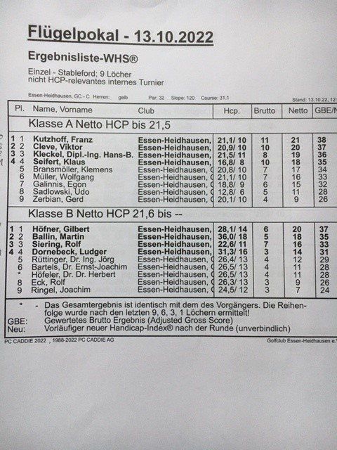 In der Klasse B (HCP 21,6 bis 54,0) hießen die drei Sieger Gilbert Höfner (37 Nettopunkte), Martin Ballin (35 Nettopunkte) und Rolf Siering (33 Nettopunkte).
