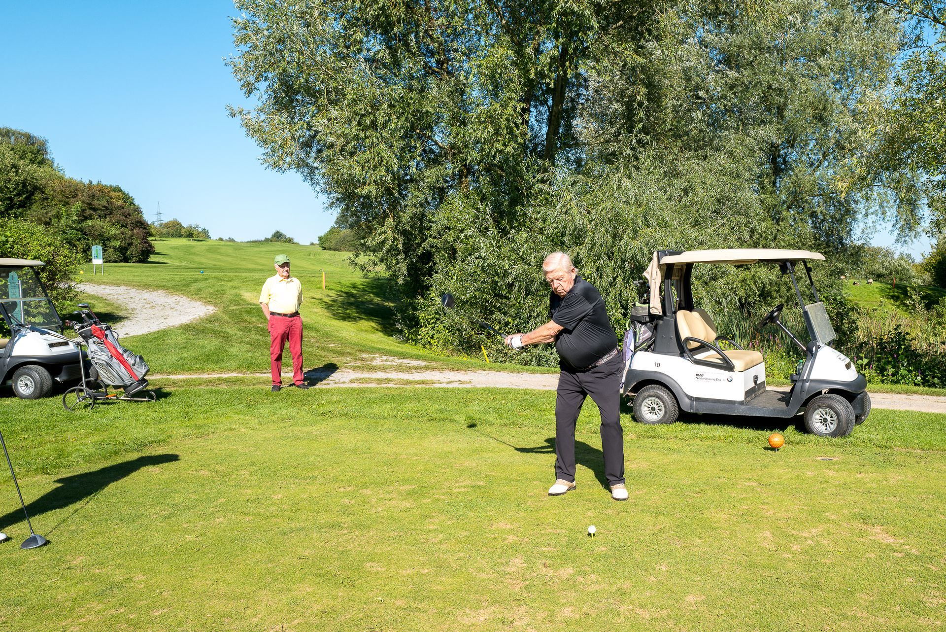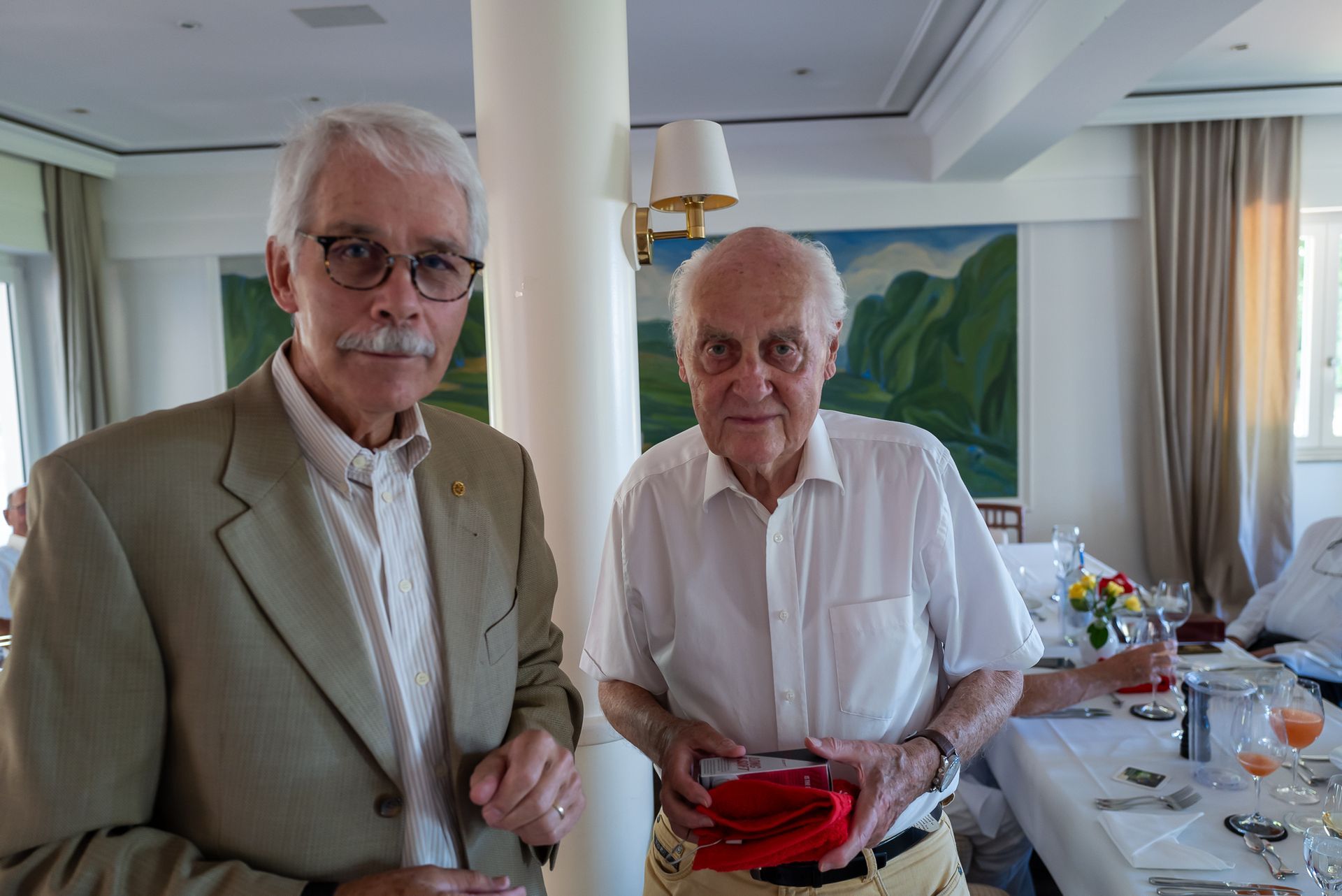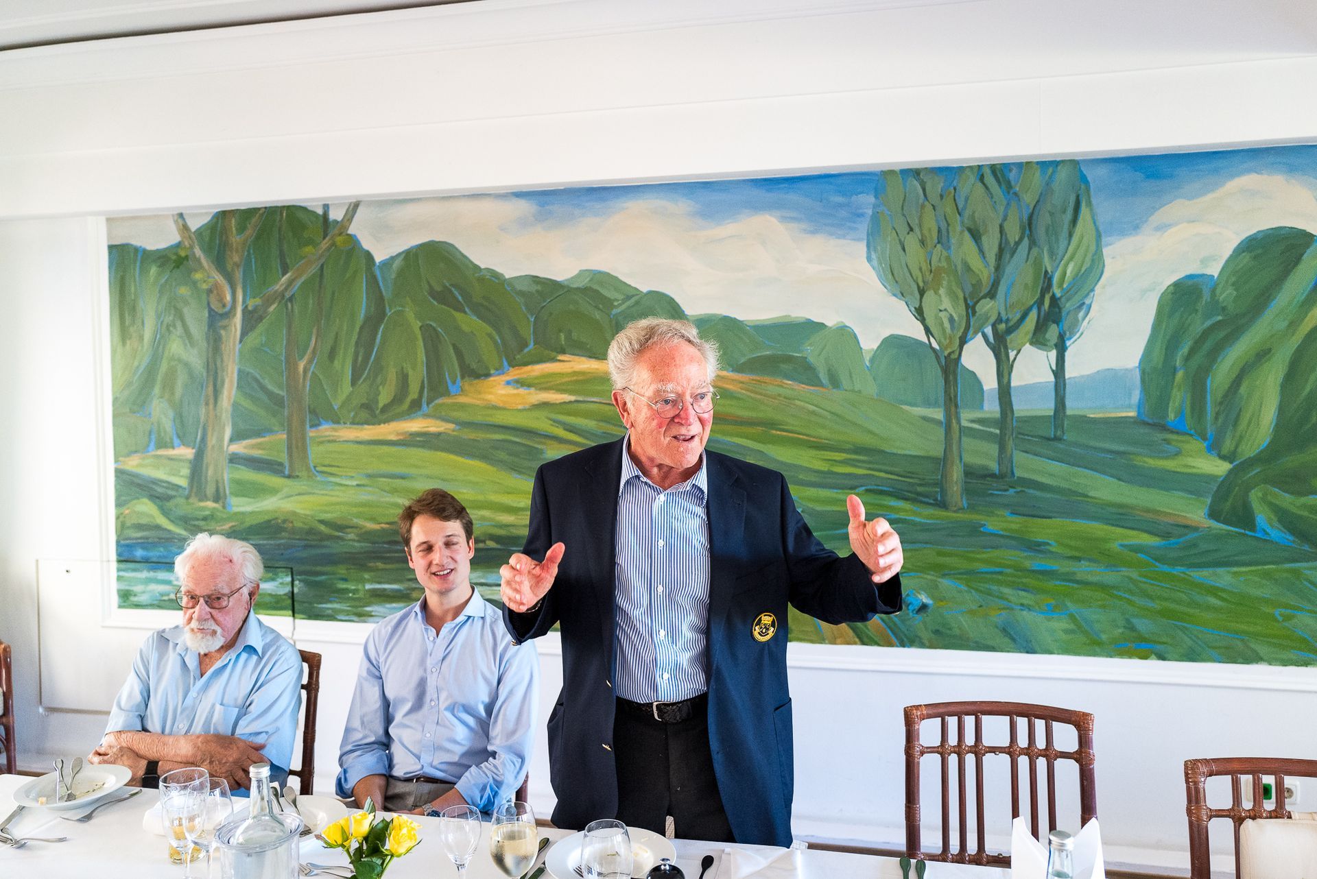 Nach ca. zwei Stunden Spielzeit trafen sich die Turnierteilnehmer geduscht und munter in der Clubgastronomie zum gemeinsamen Essen. Horst Giesen begrüßte alle Teilnehmer und ganz besonders die Gäste der benachbarten Clubs und als einen weiteren Gast, Yannik Lubisch, den Ratsherrn für das Ruhrtal (Schuir, Werden-West Heidhausen-West und Kettwig-Süd). Einigen der 80-jährigen war er kein Unbekannter, da er der Enkel des verstorbenen Mitglieds der DonnerstagsSenioren Hans-Adolf Lubisch ist. Ein weiterer nicht golfspielender Gast war Manfred Moors – ein langjähriger Freund von Horst Giesen, mit dem er etliche Erinnerungen teilt.