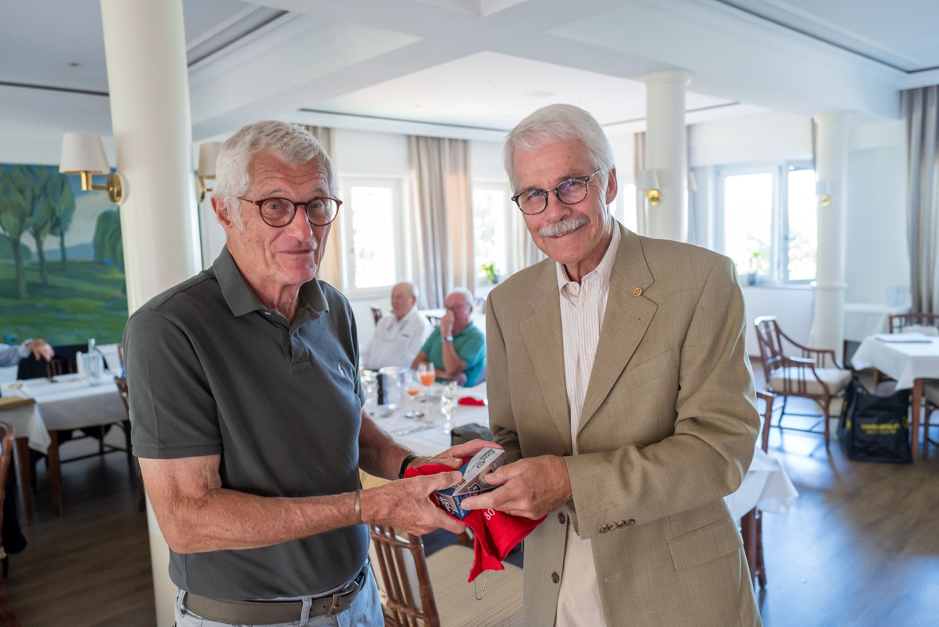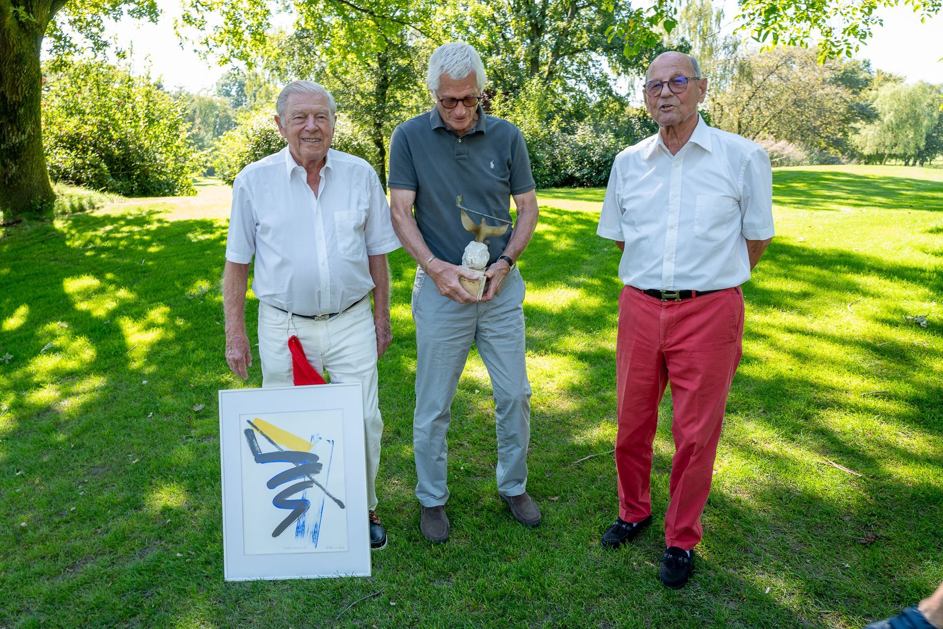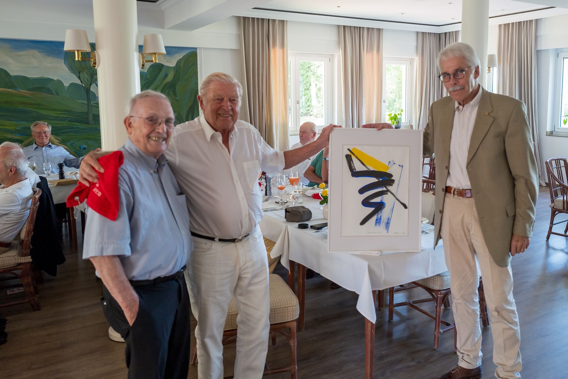 Eigentlich bekommt der Gesamtsieger des Netto den Pokal - jedoch musste dieses Mal anders entschieden werden. Dieter Birkenhauer hatte schon dreimal den Pokal gewonnen und erhielt stattdessen aus dem Nachlass des verstorbenen Mitglieds der DonnerstagsSenioren Claus Husmann ein Golfbild von dem Maler Dieter Heinen, der auch Mitglied bei den DonnerstagsSenioren ist.