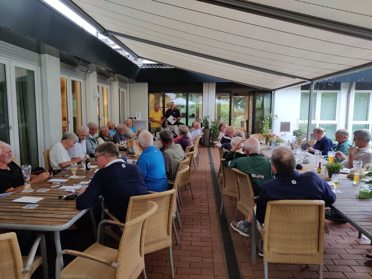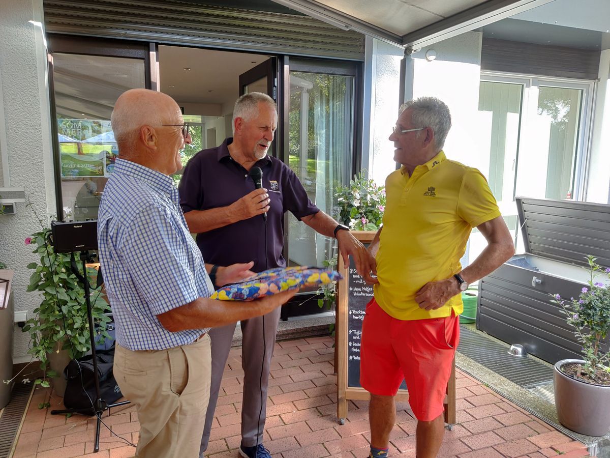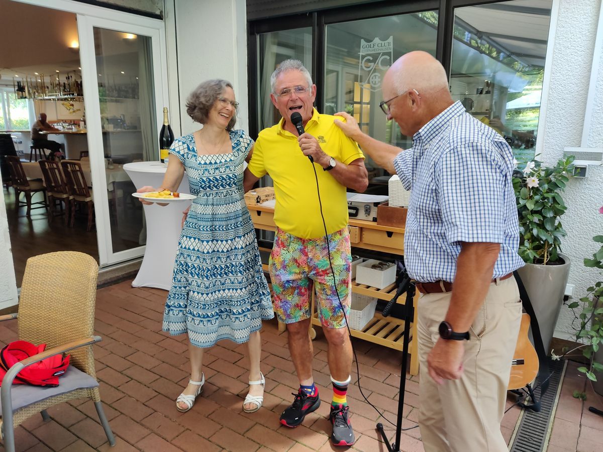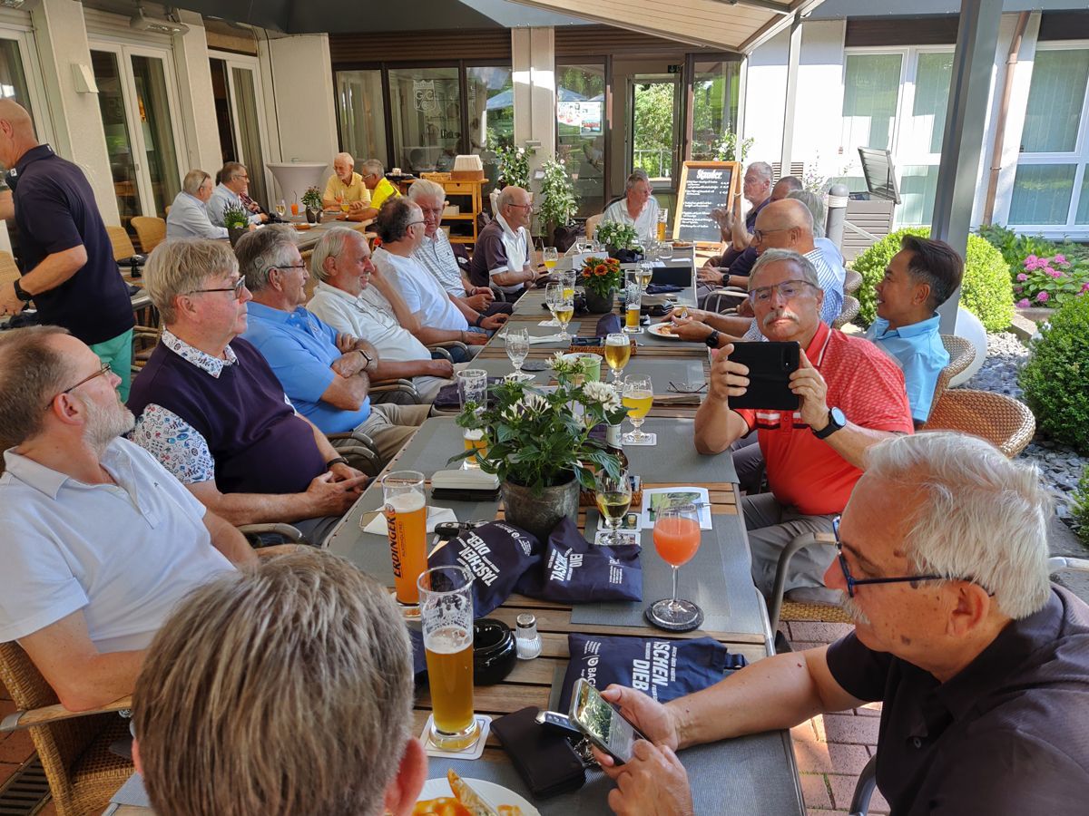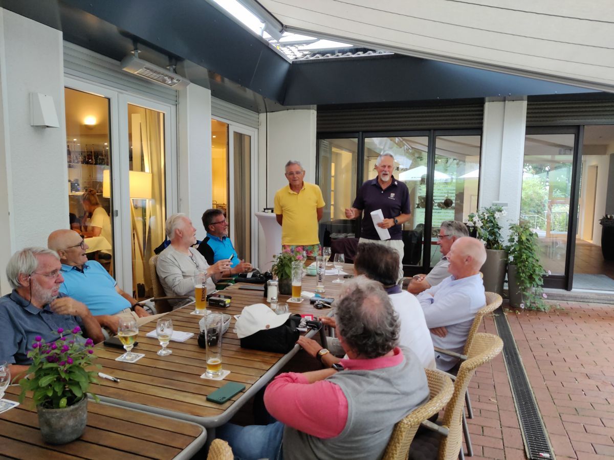 Aus diesem Anlass hatte Reinhold seine DonnerstagsSenioren am ersten Turniertag nach der Runde zum gemütlichen Beisammensein eingeladen. Unser Vereinspräsident Volker Stöber und der Sprecher der DonnerstagsSenioren Klemens Bransmöller sprachen in ihren Reden die Verdienste von Reinhold in unserer Gemeinschaft an und bedankten sich für die Einladung und seine aktive Unterstützung für den GC Heidhausen.
