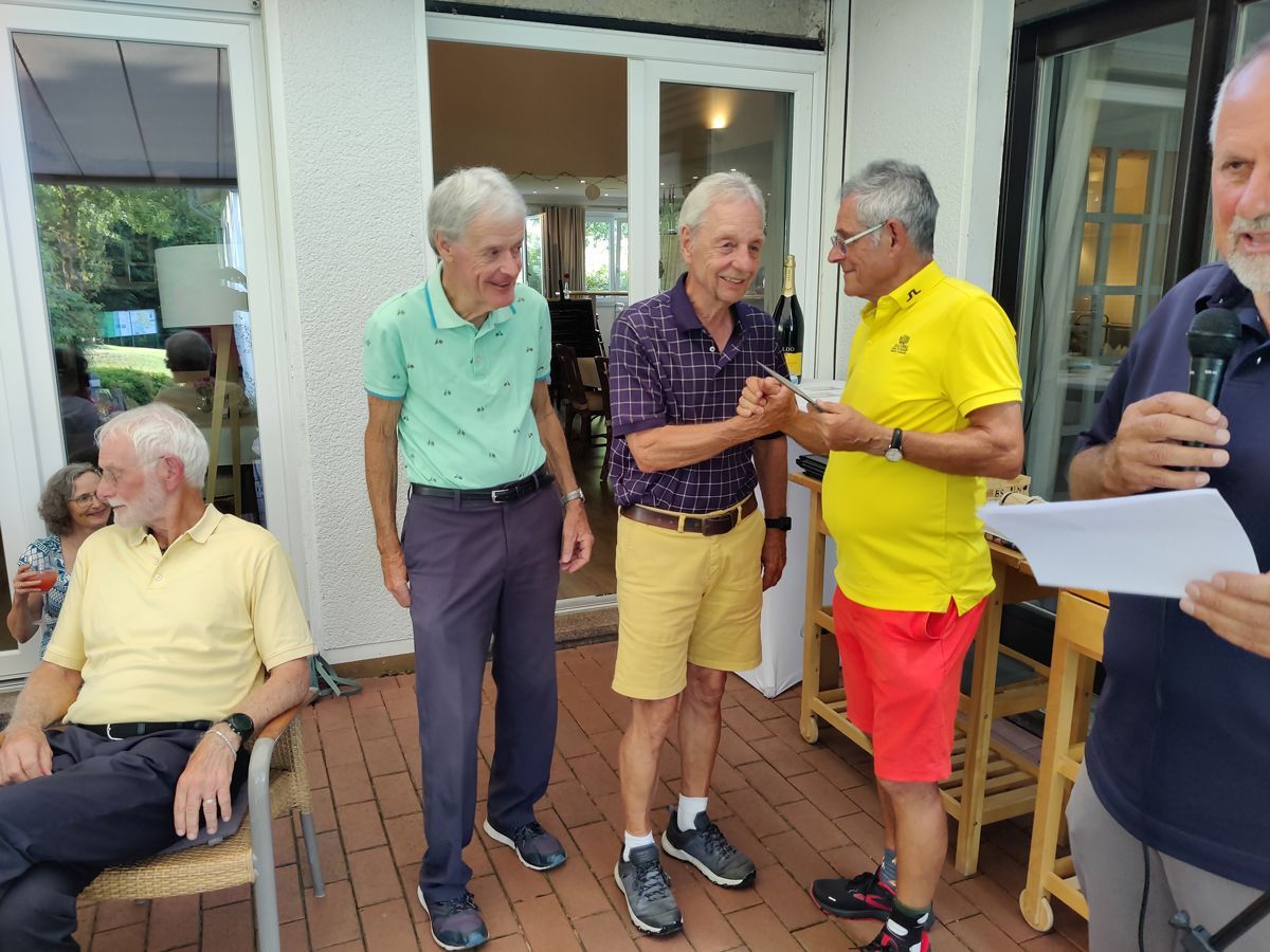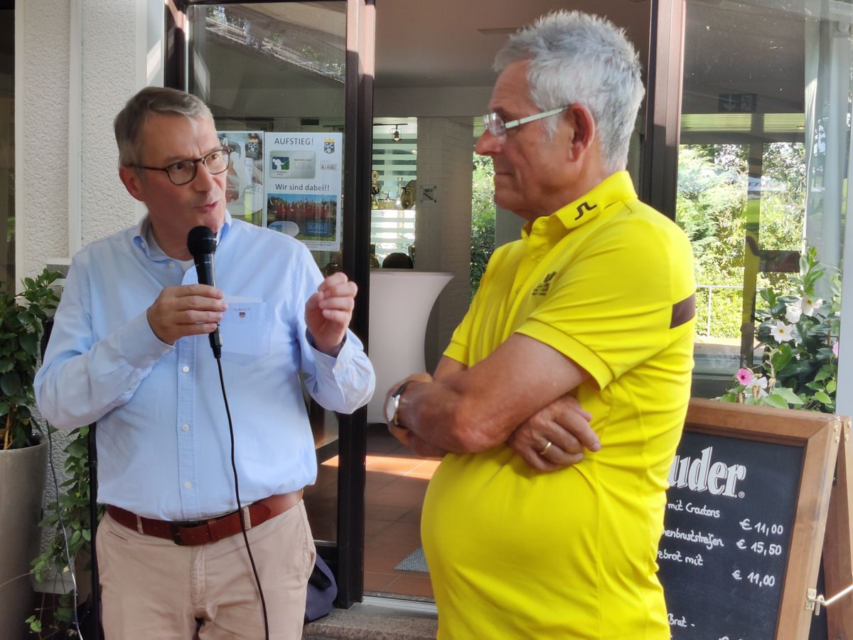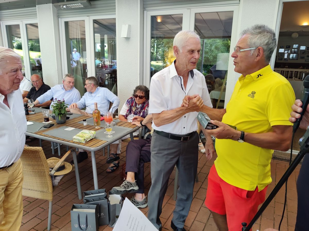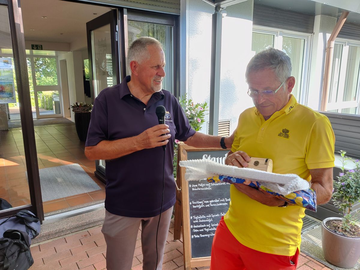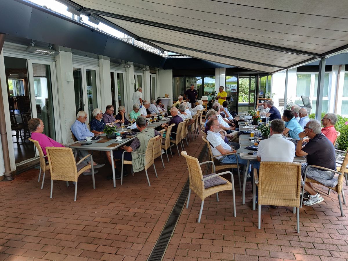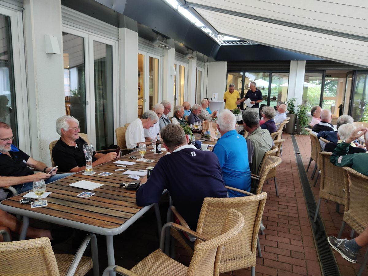 Aus diesem Anlass hatte Reinhold seine DonnerstagsSenioren am ersten Turniertag nach der Runde zum gemütlichen Beisammensein eingeladen. Unser Vereinspräsident Volker Stöber und der Sprecher der DonnerstagsSenioren Klemens Bransmöller sprachen in ihren Reden die Verdienste von Reinhold in unserer Gemeinschaft an und bedankten sich für die Einladung und seine aktive Unterstützung für den GC Heidhausen.