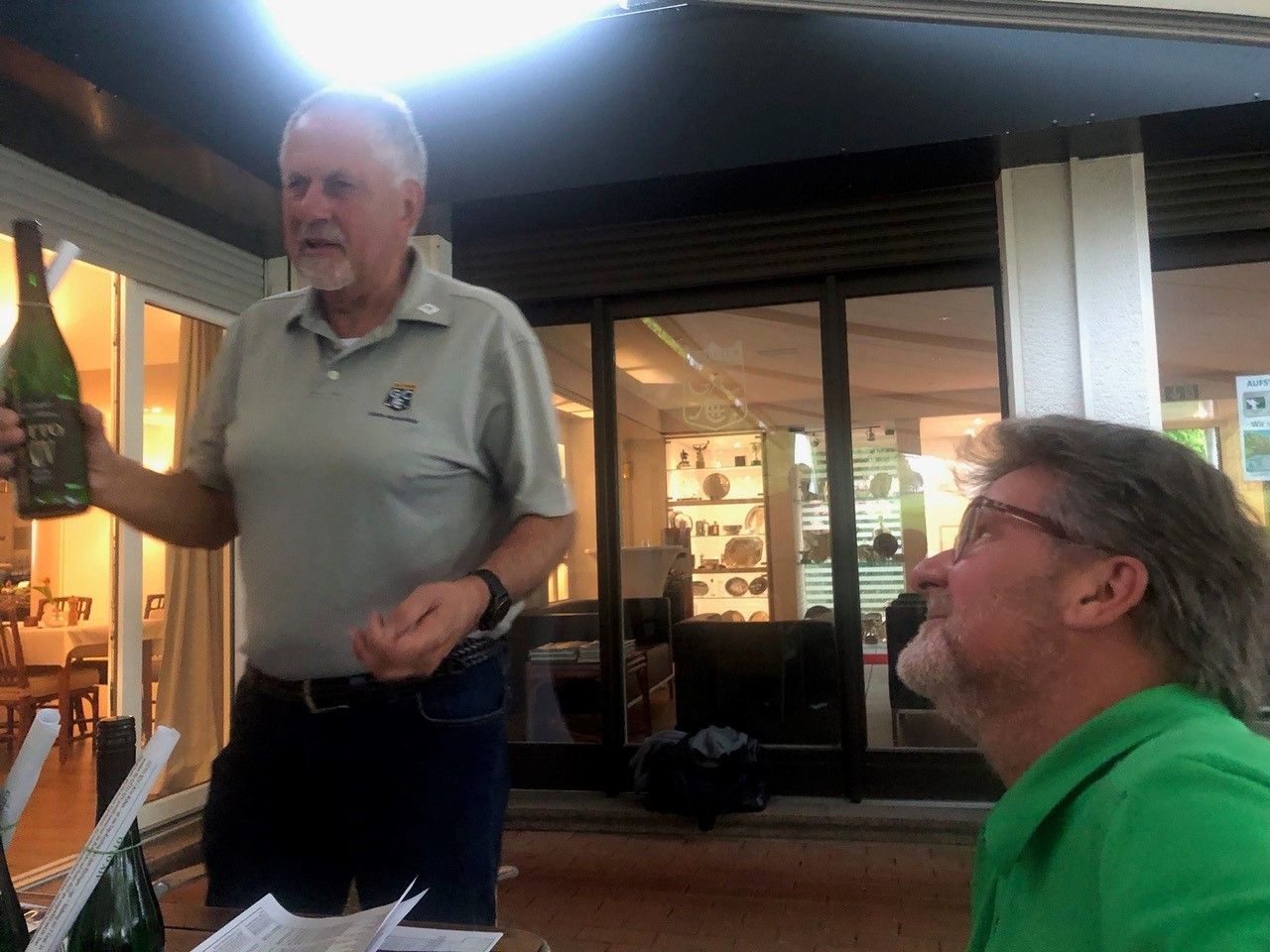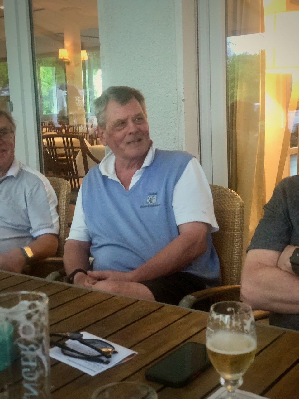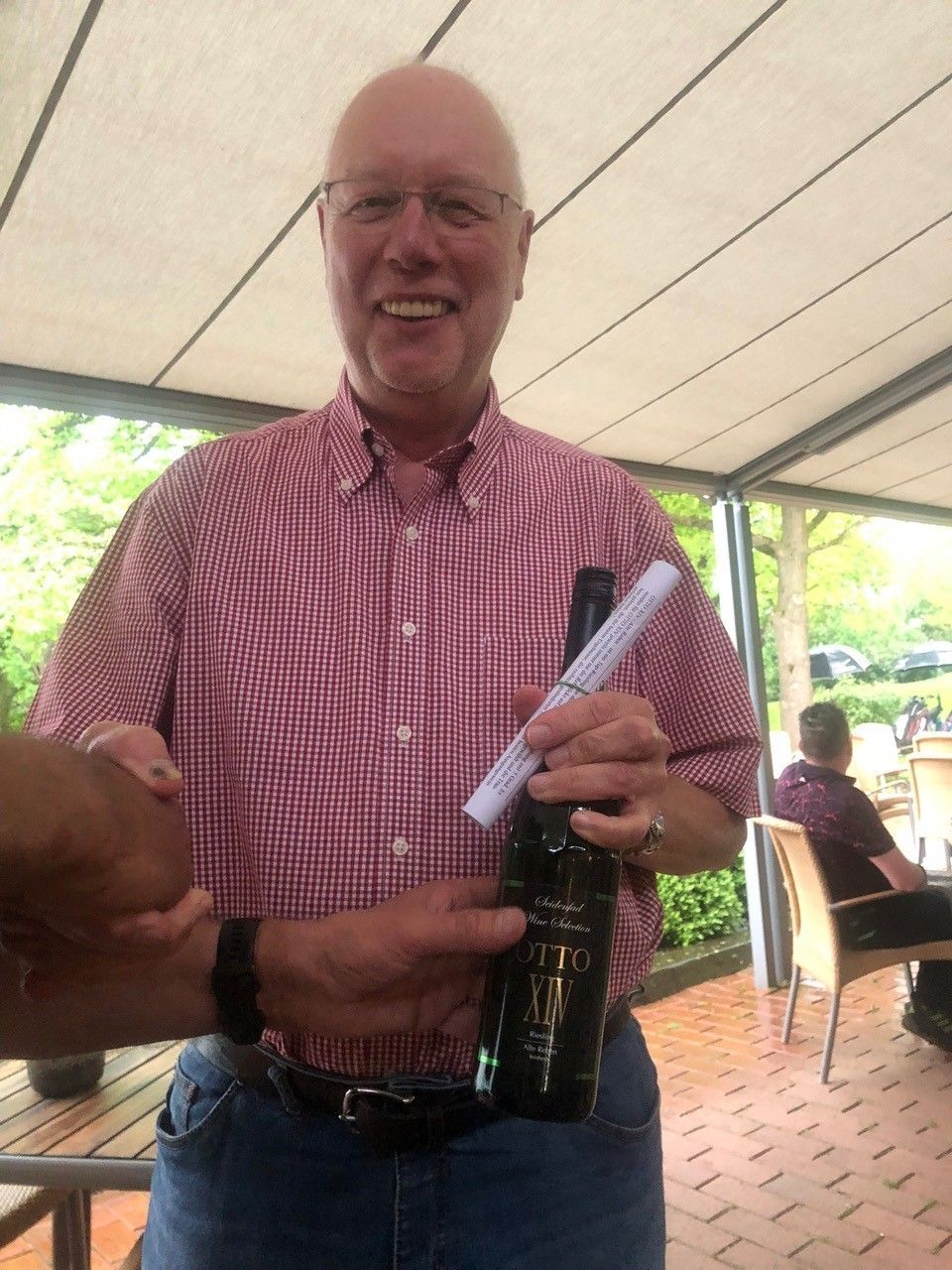 Bei den 9-Löcher-Spielern nahm Hans Kleckel die großzügig für die Saison von Otto Lackmann gesponserte Flasche Wein für das 1. Brutto mit 5 Punkten entgegen, Netto wurde er 2. mit 15 Stablefordpunkten hinter unserem „Neuen“ Raimund Wippermann (18). Dritter wurde nach Stechen Berthold Zumbrink vor Werner Lashöfer (je 13).