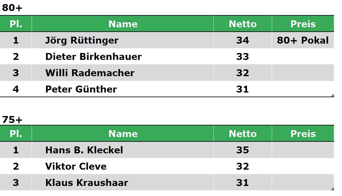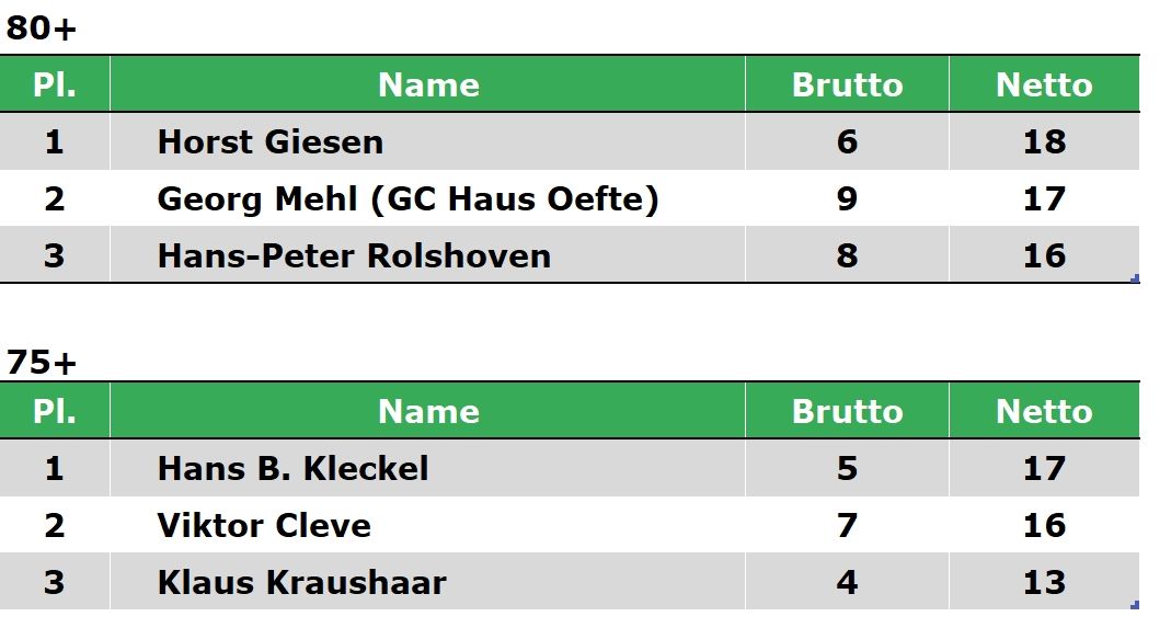 Das beste Gesamtergebnis Brutto der besten zwei Spiele erreichte Dieter Birkenhauer mit 19 Punkten bei 80+ und Viktor Cleve mit 14 Punkten bei 75+.