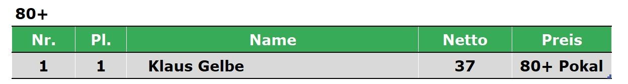 Den Pokal überreichte Marita Giesen an den Gesamtsieger. Das höchste Bruttoergebnis von den besten zwei Spielen in dieser Turnierserie bei den 80+ Spieler erreichte Klaus Gelbe (24 Brutto) und erhielt damit einen Sonderpreis.