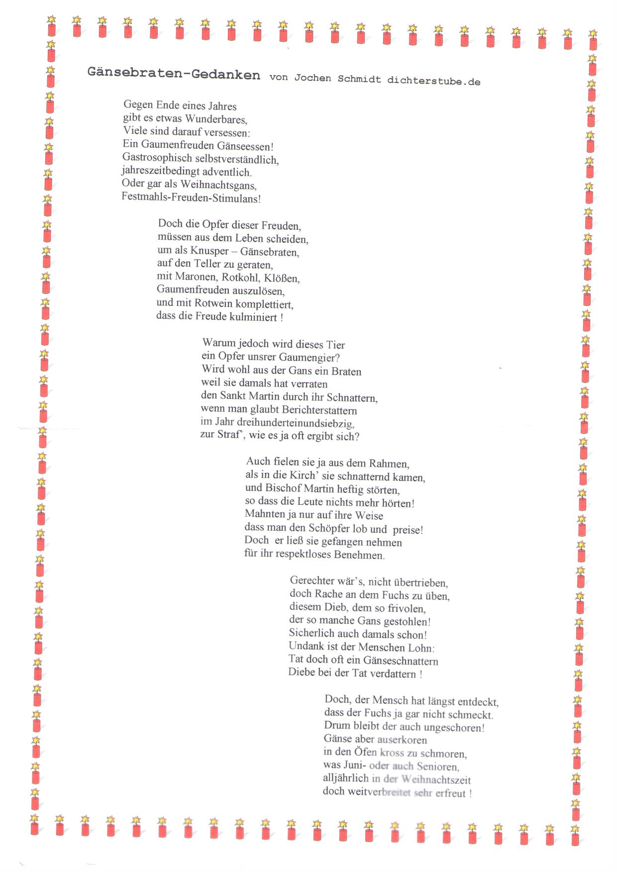 Traditionell durfte natürlich auch Jochen Schmidt – liebevoll unser „Goethe“ genannt - mit einem Gedicht nicht fehlen. Das Thema diesmal sehr naheliegend: Gänsebraten-Gedanken. Vorgetragen wurde das Gedicht von Hans-B., weil die Stimme von Jochen Schmidt leicht angeschlagen war. Gedicht, Verfasser und Vortragender wurden mit viel Beifall bedacht.