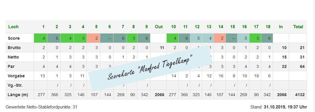Und die gespielten Ergebnisse waren beeindruckend – die Hälfte der Teilnehmer erspielte mehr als 30 Nettopunkte. Spitzenreiter war Gerd Zerbian (38), gefolgt von Jörg Rüttinger (37) und Klaus Seifert (34). Manfred Tiegelkamp konnte auf seiner Scorekarte 2 Birdies und 6 Pars verzeichnen. Kaum auszudenken, welche Ergebnisse gespielt worden wäre, wenn das Loch 6 nicht wegen Bodenfrosts gesperrt gewesen wäre. Dieser widrige Umstand hatte natürlich einige Spieler nach „eigener Aussage“ daran gehindert, hier ihr sonst übliches Birdie zu spielen!!!